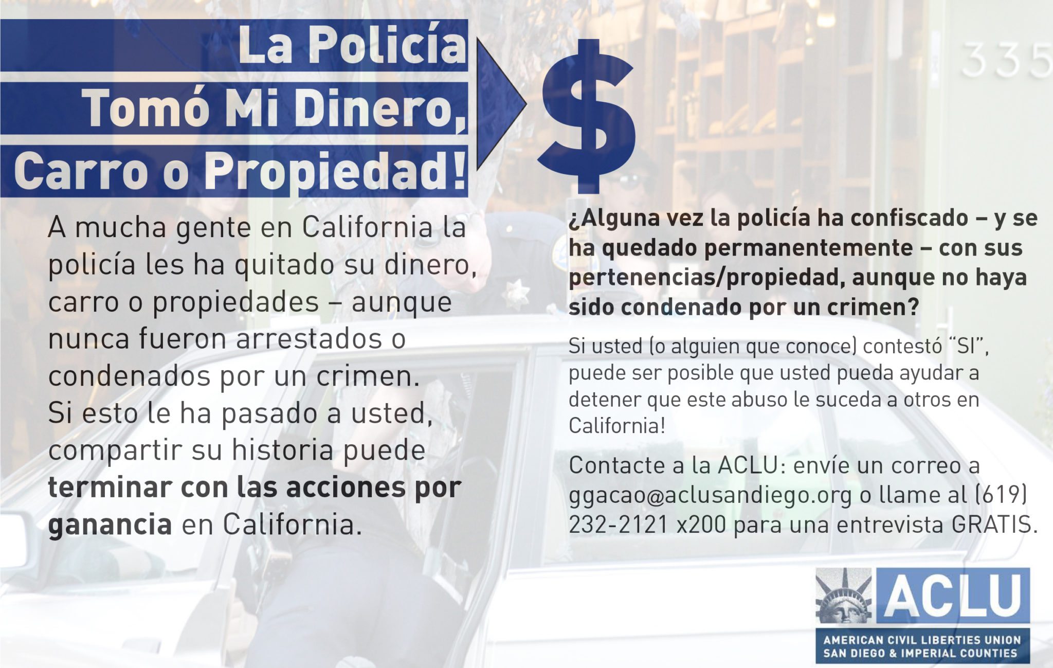 Contacte a la ACLU: envíe un correo a ggacao@aclusandiego. org o llame al (619) 232-2121 x200 para una entrevista gratis.